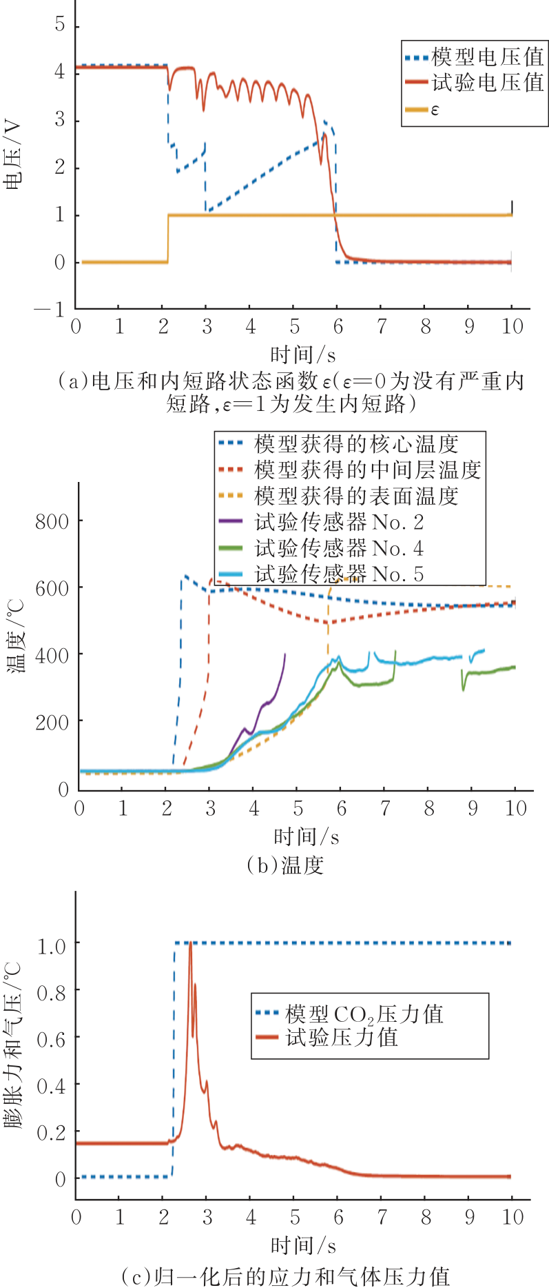 在正常使用工況下,電池的膨脹力由電池溫度變化和SOC變化分別引起的膨脹組成,MOHAN S等通過(guò)公式F=FT+FSOC對(duì)其進(jìn)行描述,其中FT和FSOC分別表示溫度和SOC引起的膨脹力;CAI T等研究了內(nèi)部短路條件下電池的膨脹力,建立了熱失控早期副反應(yīng)的氣體模型,能夠準(zhǔn)確捕捉到電池在熱失控早期的膨脹力變化。與電壓和溫度等其他參數(shù)相比,在熱失控的早期階段,膨脹力被監(jiān)測(cè)到的時(shí)間更早,如圖3所示,證明了利用膨脹力進(jìn)行預(yù)警的可行性。