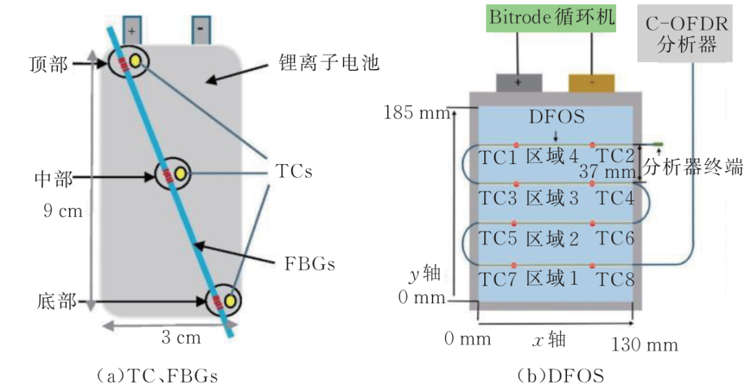除了熱電偶外,使用光纖傳感器(FOS)測(cè)量電池溫度也具有良好的發(fā)展前景。與熱電偶和熱敏電阻相比,F(xiàn)OS通常重量輕,物理尺寸較小,能夠承受高溫等惡劣環(huán)境并提供更有效的帶寬,這對(duì)于查詢(xún)電池組中的溫度傳感網(wǎng)絡(luò)很有用。NASCIMENTO M等使用光纖布拉格光柵光學(xué)傳感器(FBG)和K型熱電偶比較了鋰電池在不同恒流充電和放電倍率(0.53C、2.67C和8.25C)下,3個(gè)不同位置(電池的頂部、中部和底部)的溫度,如圖4(a)所示。試驗(yàn)結(jié)果表明,F(xiàn)BG比熱電偶具有更高的分辨率。此外,F(xiàn)OS的多路復(fù)用功能使得可以在單根光纖上提供多個(gè)監(jiān)測(cè)點(diǎn),從而在高測(cè)量點(diǎn)密度的情況下實(shí)現(xiàn)最小的布線要求,適用于大型鋰電池組的多點(diǎn)測(cè)量,如圖4(b)所示。