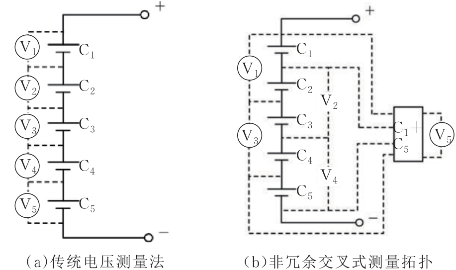 目前,BMS依靠端電壓和表面溫度測(cè)量來(lái)監(jiān)測(cè)熱失控。由于故障的相似性(如傳感器故障和電池故障)和隱藏性(如內(nèi)部短路和連接故障),早期的BMS只能診斷簡(jiǎn)單的電池故障,如過(guò)充、過(guò)放和過(guò)熱等,并且預(yù)警時(shí)間較晚。為了提高準(zhǔn)確性,端子電壓的監(jiān)測(cè)變成了冗余電池電壓傳感器拓?fù)錅y(cè)量。雖然這種方法提供了良好的精度和冗余度,但它相應(yīng)地使所需的傳感器數(shù)量、布線、空間占用和成本加倍。如圖5所示,電壓傳感器交叉連接,串聯(lián)的傳感器數(shù)量與電池?cái)?shù)量相同。并且,由于電壓傳感器直接連接到電極,所以排除了來(lái)自連接線之間的電阻干擾。這種測(cè)量拓?fù)湓诒WC精度的基礎(chǔ)上基本上不增加系統(tǒng)的硬件和復(fù)雜性。但電壓變化的規(guī)律性較差,并且在電壓發(fā)生顯著變化之前熱失控已經(jīng)發(fā)生。因此,將電壓降低信號(hào)作為熱失控的預(yù)警信號(hào),需要結(jié)合其他特征參數(shù)進(jìn)行綜合判斷。