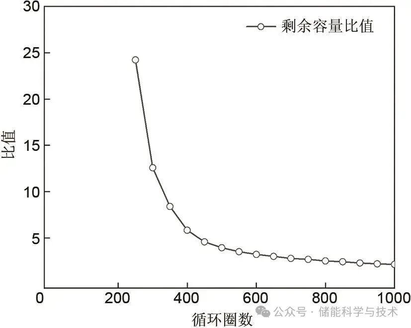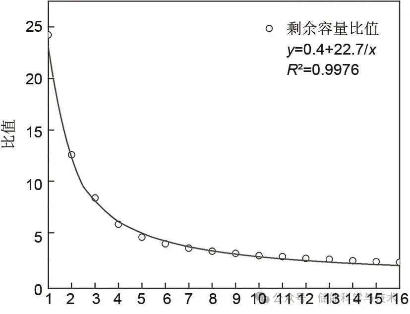 為了繼續(xù)探究環(huán)境溫度對儲能電池循環(huán)性能的影響,本工作將兩次循環(huán)試驗(yàn)的容量衰減率平均值的比值進(jìn)行函數(shù)擬合。圖4為45 ℃與25 ℃容量衰減率比值,由圖可知,由于常溫測試的容量在初期階段先增加了一段時間后才緩慢衰減,因此比值較大,隨著循環(huán)圈數(shù)的逐漸增加,高溫容量衰減率逐漸趨于常溫容量衰減率的2倍,且曲線近似反比例函數(shù)與常數(shù)的和(y=a+b/x)。為簡化擬合方程,將橫坐標(biāo)250圈定義為1,300圈定義為2,以此類推,1000圈定義為16,函數(shù)擬合結(jié)果如圖5所示。在擬合方程y=a+b/x中,a=0.4,b=22.7,相關(guān)系數(shù)R2=0.9976,表明函數(shù)擬合結(jié)果較好。由于本試驗(yàn)采用的兩種環(huán)境溫度均嚴(yán)格參考了GB/T 36276標(biāo)準(zhǔn)中的規(guī)定,因此試驗(yàn)結(jié)果不僅能夠準(zhǔn)確反映電池在該標(biāo)準(zhǔn)條件下的性能表現(xiàn),還對其他參考該國標(biāo)進(jìn)行的循環(huán)試驗(yàn)具有重要的預(yù)測作用和參考價值。研究結(jié)論可為電池制造商、檢測機(jī)構(gòu)以及相關(guān)研究人員提供可靠的數(shù)據(jù)支持,幫助優(yōu)化電池設(shè)計和測試方法,同時為制定和修訂相關(guān)行業(yè)標(biāo)準(zhǔn)提供科學(xué)依據(jù),從而推動電池技術(shù)的規(guī)范化發(fā)展。