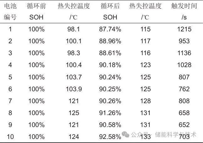 (2)安全性能測試結(jié)果表明,經(jīng)過一段時間循環(huán)測試的舊電池與新電池相比熱失控溫度更高,并且熱失控溫度與SOH具有一定的比例關(guān)系,二者比值(熱失控溫度/SOH)為130~145,即通過測定電池循環(huán)后的SOH可對其安全性能做出較準(zhǔn)確的評估。