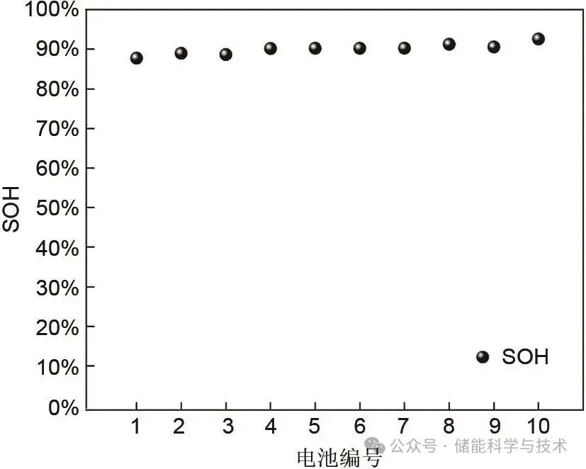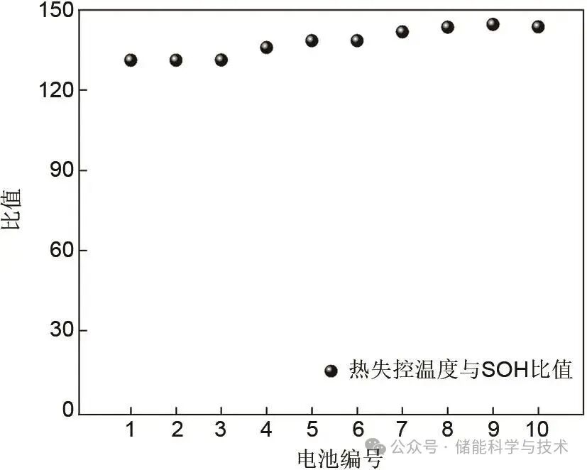 一般來說,鋰離子電池在充放電循環(huán)一段時間后均會發(fā)生容量衰減,造成SOH降低,從而對熱失控溫度造成一定影響。本工作進(jìn)一步探究SOH和熱失控溫度的關(guān)系,測試結(jié)果如表2所示。圖7是10塊電池經(jīng)過1000次充放電循環(huán)后的SOH,SOH均保持在(90±3)%之間,平均值為90.07%。計算熱失控溫度與SOH的比值,計算結(jié)果表明該比值均在130~145之間(圖8),具有較好的一致性,即通過測定循環(huán)后電池的SOH,可以間接評估電池的熱穩(wěn)定性,并大致估算其熱失控溫度,從而顯著提高試驗(yàn)人員對電池安全風(fēng)險的監(jiān)控能力。結(jié)合SOH與熱失控溫度的關(guān)聯(lián)分析,還可為電池的壽命預(yù)測、維護(hù)周期制定以及退役標(biāo)準(zhǔn)提供科學(xué)支持,進(jìn)一步提升儲能系統(tǒng)的安全性和可靠性,為電池的全生命周期管理提供有力保障。在儲能電池的實(shí)際應(yīng)用過程中亦可為長期使用的電池安全性能評估提供一定參考,為儲能電站建立基于壽命衰減狀態(tài)的分級安全評估體系提供數(shù)據(jù)支撐。除此之外,本工作對循環(huán)后電池的SOH和熱失控時間也進(jìn)行了探究,結(jié)果如表2所示。研究結(jié)果表明二者并無明顯關(guān)系,相關(guān)性較低。其主要原因是電池?zé)崾Э貢r間可能與多種因素相關(guān),例如不同廠家的電池制備工藝不同、電池內(nèi)部材料成分或組成比例的差異、電池外部或內(nèi)部可能存在缺陷和試驗(yàn)時外部環(huán)境條件略有不同等。