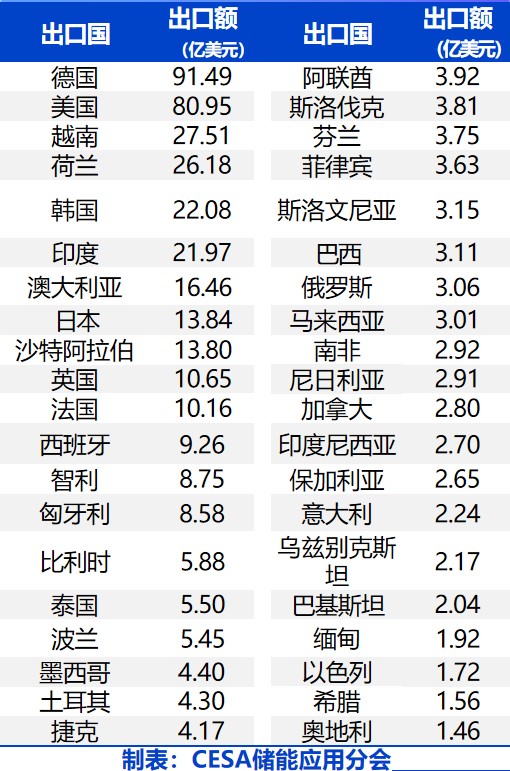 值得關注的是,從2025年5月份開始,德國已經取代美國成為中國鋰離子電池第一大出口市場,1-8月出口額為91.49億美元,同比增長30.59%,占中國鋰離子出口總額的18.9%。第二大市場為美國,1-8月出口總金額為80.95億美元,同比下降7.69%,占比16.8%。越南為第三大出口市場,出口金額為27.51億美元,同比增長9.32%,占比5.7%。前十大出口國家中,同比增幅最大的國家有沙特阿拉伯、智利、澳大利亞。
