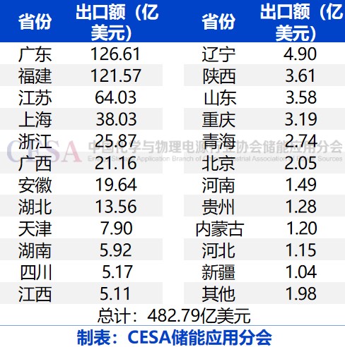 據(jù)CESA儲能應用分會不完全統(tǒng)計,2025年1-8月,廣東成為中國鋰離子電池出口產品的最大來源地,出口金額為126.61億美元,同比增長39.7%,占中國鋰離子電池出口額的26.2%。福建位居第二,出口金額為121.57億美元,同比增加17.95%,占比25.2%。江蘇排名第三,出口額為64.03億美元,同比增長3.81%,占比13.3%。福建、廣東和江蘇三省的鋰離子電池出口額占到全國鋰離子電池出口額的64.7%。出口金額增幅最大的三個省分別是湖北、湖南、廣西,出口額分別增長105.39%、86.13%和80.93%。出口數(shù)量增幅最大的三個省市分別為廣西、湖南、福建,出口數(shù)量分別增長了10.97%、46.79%和29.6%。