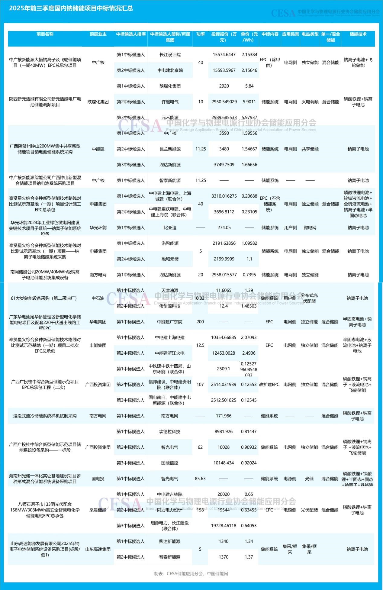 2025年前三季度,CESA儲能應(yīng)用分會產(chǎn)業(yè)數(shù)據(jù)庫共收錄了33條鈉電儲能有效報(bào)價數(shù)據(jù),來自17個中標(biāo)/開標(biāo)公示項(xiàng)目,包括EPC、儲能系統(tǒng)等,其中,鈉電儲能系統(tǒng)中標(biāo)候選人報(bào)價20條。