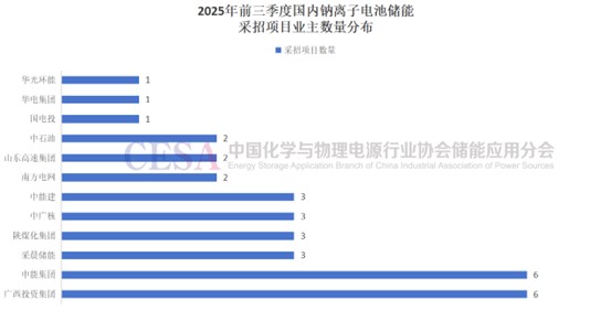 2025年前三季度鈉電儲能中標(biāo)公示(含中標(biāo)候選人公示)的項(xiàng)目業(yè)主中,廣西投資集團(tuán)和申能集團(tuán)兩家領(lǐng)跑,各自采招了6個項(xiàng)目,數(shù)量占比均為18.18%,并列第一。