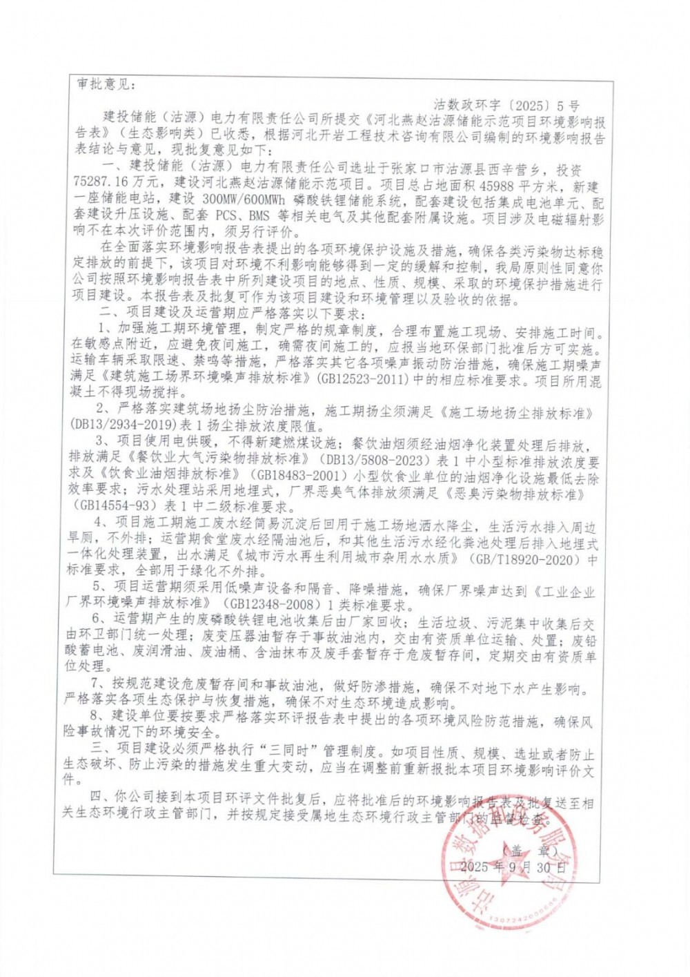 關(guān)于建投儲(chǔ)能(沽源)電力有限責(zé)任公司河北燕趙沽源儲(chǔ)能示范項(xiàng)目建設(shè)項(xiàng)目環(huán)境影響報(bào)告表的審批決定公告