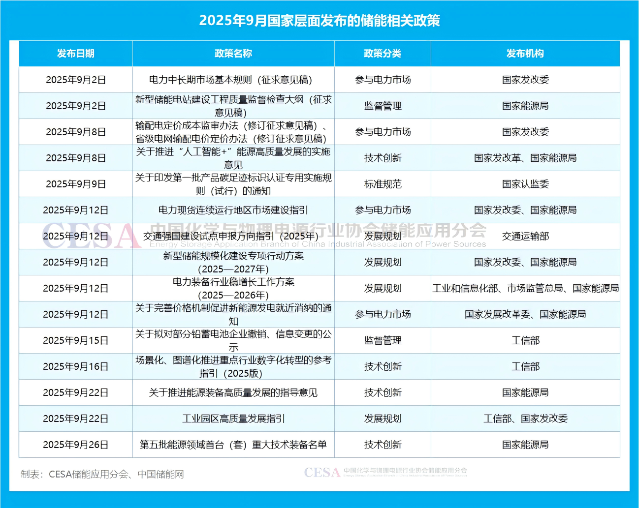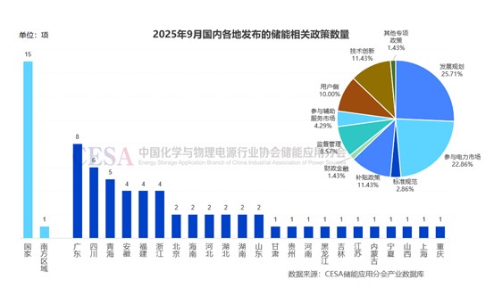 中國儲能網(wǎng)訊:據(jù)CESA儲能應(yīng)用分會產(chǎn)業(yè)數(shù)據(jù)庫不完全統(tǒng)計,2025年9月份共發(fā)布儲能相關(guān)政策71項,國家層面發(fā)布15項,是今年以來國家級儲能相關(guān)政策發(fā)布最密集的一個月份。從分類來看,發(fā)展規(guī)劃、技術(shù)創(chuàng)新以及參與電力市場類政策各有4項,體現(xiàn)國家層面對儲能行業(yè)高質(zhì)量發(fā)展與新型電力系統(tǒng)建設(shè)的重視。監(jiān)督管理類2項,標準規(guī)范類1項。