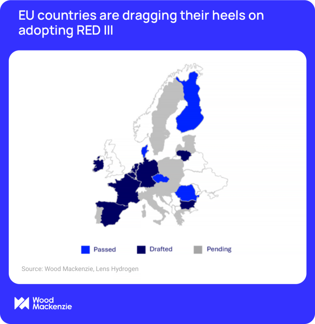將RED III相關(guān)要求轉(zhuǎn)化為各成員國國內(nèi)法律的進(jìn)展遲緩,這對(duì)投資決策造成阻礙,削弱了市場信心。由于各成員國缺乏明確的國內(nèi)法規(guī),項(xiàng)目開發(fā)商無法評(píng)估業(yè)務(wù)的可行性,也無法獲取融資,更難以開展跨境合作項(xiàng)目。