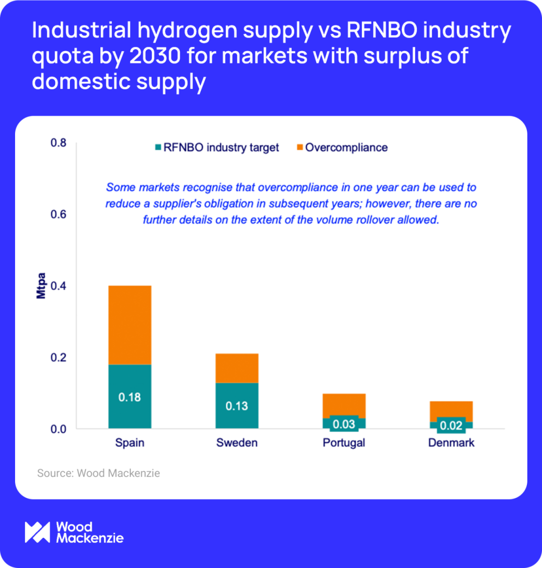 在運(yùn)輸領(lǐng)域,合規(guī)路徑似乎更為明確,處罰措施能向市場釋放清晰信號(hào)。煉油廠路徑正逐漸成為實(shí)現(xiàn)合規(guī)的首選方式,但并非所有煉油廠都已落實(shí)RFNBO的供應(yīng)渠道和配套基礎(chǔ)設(shè)施。就工業(yè)目標(biāo)而言,歐盟多數(shù)國家有能力實(shí)現(xiàn)42%的RFNBO配額要求。然而,各國在將指令轉(zhuǎn)化為國內(nèi)法律方面進(jìn)展遲緩,這讓項(xiàng)目開發(fā)商持續(xù)面臨不確定性。伍德麥肯茲分析指出,進(jìn)口對(duì)于滿足工業(yè)配額至關(guān)重要。在歐盟成員國中,僅有西班牙、瑞典、葡萄牙和丹麥能夠依靠國內(nèi)過剩產(chǎn)能完成配額任務(wù)。
