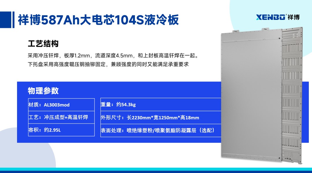 祥博傳熱科技的587Ah大電芯104S液冷板采用沖壓成型+高溫釬焊工藝,材質為AL3003mod,具備優(yōu)異的導熱性與結構強度;重量54.3kg,兼顧輕量化與高承重能力,可很好適配電網(wǎng)側儲能電站、工商業(yè)儲能集裝箱、新能源配套儲能系統(tǒng)、高倍率充放電應用場景。