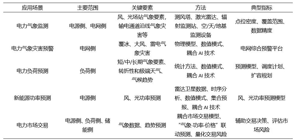 氣象作為六要素之一,是保障電力系統(tǒng)穩(wěn)定運行、提高新能源利用效率以及實現(xiàn)電力行業(yè)能源結(jié)構(gòu)轉(zhuǎn)型的重要支撐。隨著新型電力系統(tǒng)的不斷發(fā)展,氣象服務(wù)的應(yīng)用貫穿在規(guī)劃設(shè)計、運行調(diào)度以及災(zāi)害預(yù)警等不同環(huán)節(jié),呈現(xiàn)出多元性的特征。目前,氣象服務(wù)已成為提升電力系統(tǒng)安全、效率和智能化水平的關(guān)鍵支撐。根據(jù)電力氣象服務(wù)在新型電力系統(tǒng)中的主要應(yīng)用場景,主要可分為電力氣象監(jiān)測、電力氣象災(zāi)害預(yù)警、電力負荷預(yù)測、新能源功率預(yù)測和電力市場交易。下表給出不同場景下的電力氣象服務(wù)應(yīng)用維度。