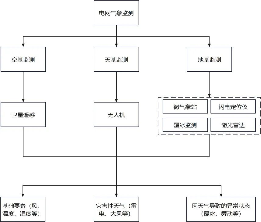 微氣象監(jiān)測站是一種布設(shè)在桿塔或線路周邊的小型設(shè)備,能夠?qū)崟r采集風(fēng)速、風(fēng)向、溫度、濕度、氣壓、降水等參數(shù),采用抗電磁干擾和低溫設(shè)計,以應(yīng)對高壓電流傳輸和山區(qū)惡劣天氣。覆冰監(jiān)測裝置能夠通過拉力傳感器、傾角傳感器和圖像識別攝像頭實時監(jiān)測導(dǎo)地線覆冰厚度、冰重及形態(tài)變化,部分設(shè)備還配備熱成像儀,用于輔助判別覆冰類型。此外還有閃電定位儀、激光雷達、衛(wèi)星遙感和無人機巡檢等技術(shù),充分彌補了電力監(jiān)測點位稀疏、監(jiān)測能力不足的問題。