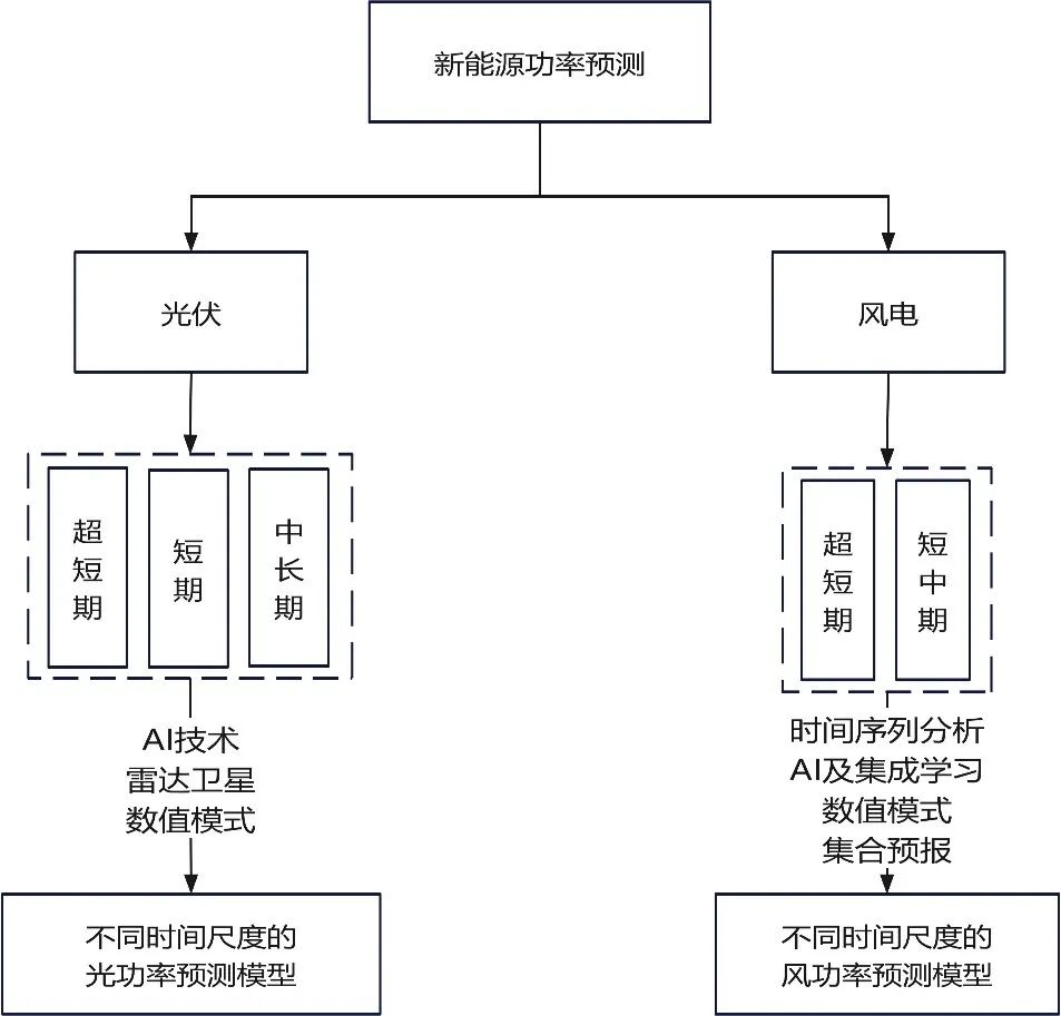 在實際應(yīng)用中,光伏功率預(yù)測的時間尺度分為超短期(0-4小時)、短期(1-3天)、中長期(周至數(shù)月)預(yù)測。超短期預(yù)測主要服務(wù)于實時調(diào)度控制,短期預(yù)測服務(wù)于日前調(diào)度計劃和電力市場交易,中長期預(yù)測則用于支撐電力系統(tǒng)的規(guī)劃設(shè)計。針對超短期光伏功率預(yù)測,研究者們利用特征相關(guān)性分析結(jié)果,基于機器學(xué)習(xí)或深度學(xué)習(xí)方法(隨機森林、LSTM等)構(gòu)建時序預(yù)測模型,實現(xiàn)了光伏功率的超短期時序預(yù)測。云會對太陽光線造成遮擋,影響光伏出力,為更好地捕獲其動態(tài)變化,國網(wǎng)和南網(wǎng)各大調(diào)度中心還引入了衛(wèi)星云圖和雷達數(shù)據(jù),通過卷積神經(jīng)網(wǎng)絡(luò)(CNN)等深度學(xué)習(xí)算法提取云系運動特征,顯著提升了對短時輻照波動和遮擋效應(yīng)的預(yù)測精準(zhǔn)度。短期和中長期預(yù)測需要借助數(shù)值天氣預(yù)報,但由于其系統(tǒng)性偏差問題,一些研究通過卡爾曼濾波等模式后處理方法對數(shù)值模式輸出的太陽輻射預(yù)報數(shù)值進行訂正,以減小誤差,提升預(yù)測的精度,還通過集成多模型機器學(xué)習(xí)框架,如XGBoost、LightGBM等,有效融合多源氣象信息與發(fā)電功率數(shù)據(jù),提升不同天氣下的預(yù)測穩(wěn)健性。此外,隨著分布式光伏裝機量的增加,很多研究針對分布式發(fā)電功率預(yù)測開展了相關(guān)研究,這些研究主要是基于網(wǎng)格化天氣預(yù)報的結(jié)果,結(jié)合人工智能模型進行預(yù)測。
