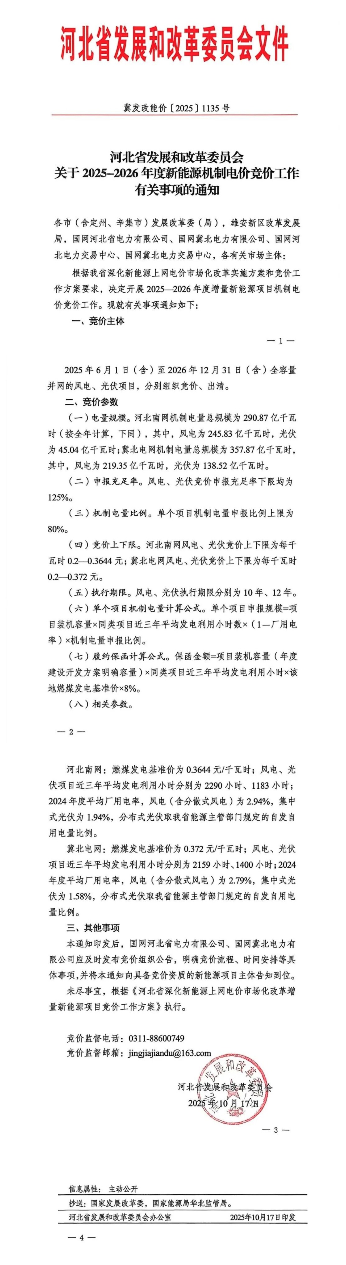 中國儲能網(wǎng)訊:10月17日,河北省發(fā)改委發(fā)布《關(guān)于2025-2026年度新能源機(jī)制電價競價工作有關(guān)事項的通知》。文件指明: