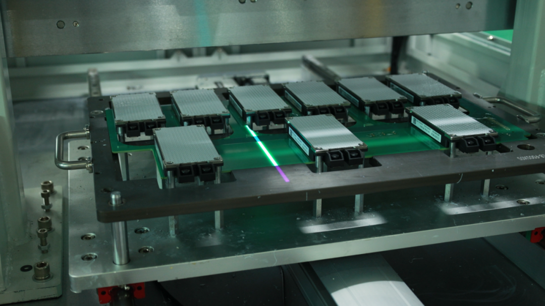產(chǎn)線革新后,奇點(diǎn)能源首次采用基于3D線激光測量技術(shù)的全自動硅脂涂覆與檢測一體化設(shè)備,通過實(shí)時三維掃描,有效管控9個IGBT硅脂涂覆厚度的一致性,從而保障它與液冷板貼合過程中的導(dǎo)熱穩(wěn)定性。