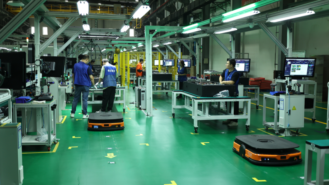 區(qū)別于傳統(tǒng)的滾筒線生產(chǎn)模式,奇點(diǎn)能源采用AGV實(shí)現(xiàn)產(chǎn)線動態(tài)重構(gòu)。該模式可根據(jù)不同產(chǎn)品間的工藝路線實(shí)時調(diào)整工位布局,有效縮短產(chǎn)線換型時間,支持PCS2000-G4/G5等多型號產(chǎn)品的快速柔性切換生產(chǎn)。