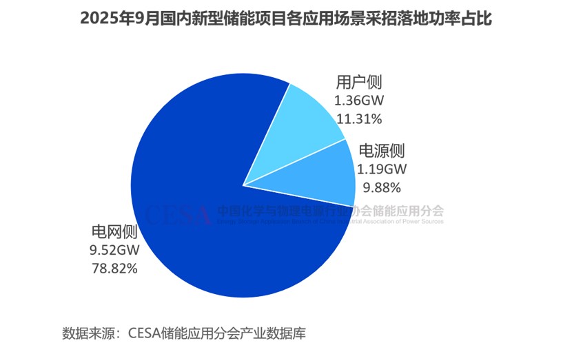 除去集采/框采以及部分未披露應用場景的項目,2025年9月,應用場景明確的儲能新增采招落地項目總規(guī)模達12.07GW/33.65GWh,其中電網側9.52GW/27.84GWh,占比78.82%(功率)/82.75%(容量);電源側1.19GW/2.38GWh,占比9.88%(功率)/7.07%(容量),用戶側1.36GW/3.43GWh,占比11.31%(功率)/10.18%(容量),9月用戶側儲能新增采招落地規(guī)模已超過電源側。