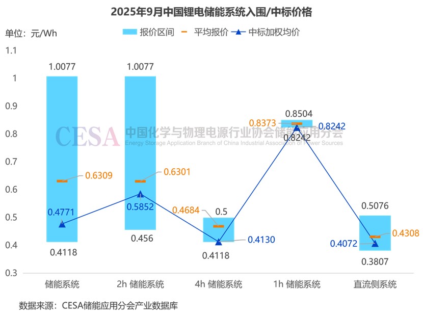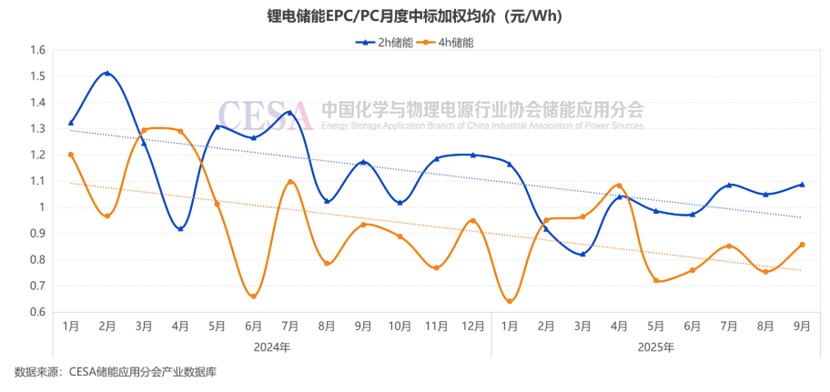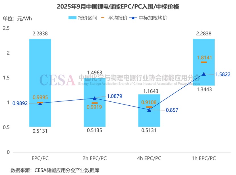 2025年9月,鋰電儲能EPC/PC(不含工商業(yè)儲能柜EPC)入圍報價主要集中在0.5131-2.2838元/Wh區(qū)間內,平均價格0.9995元/Wh,中標加權均價0.9892元/Wh,環(huán)比+17.57%。