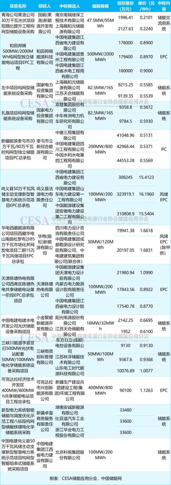 表 2025年9月混合儲能新增采招落地項目價格及中標詳情