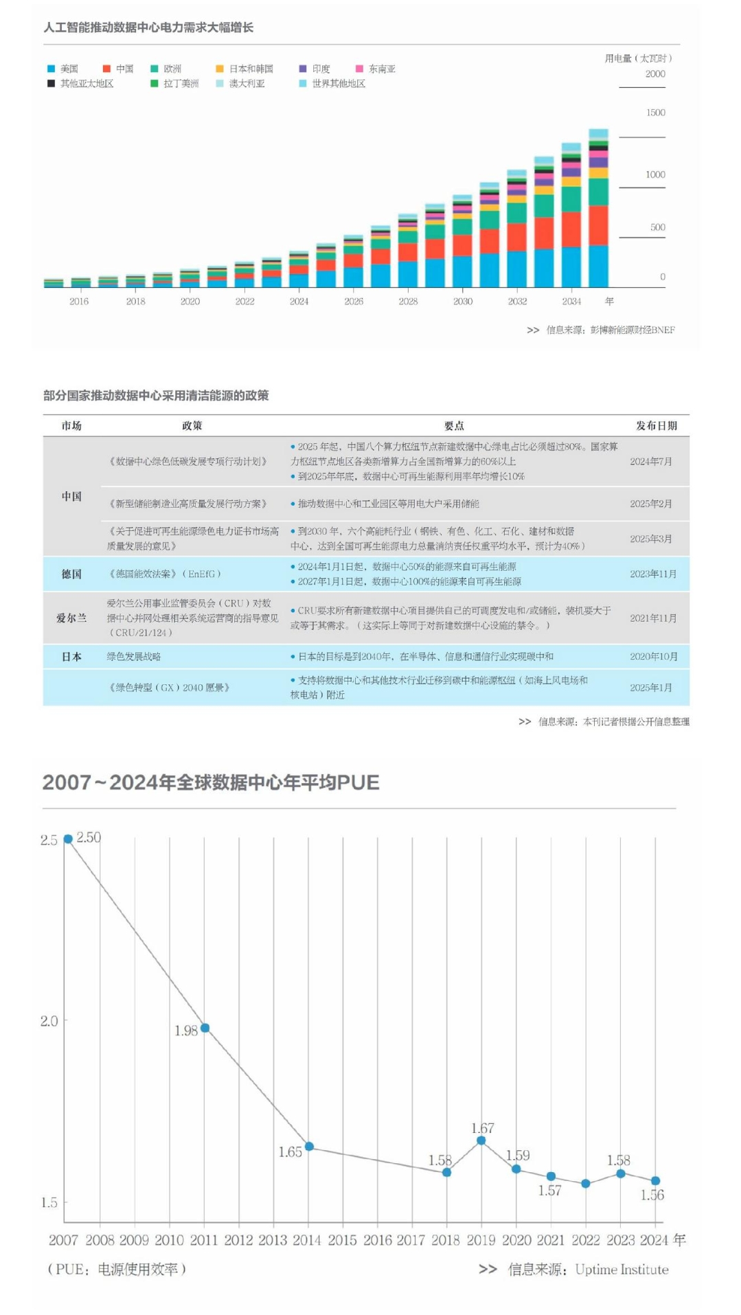 全球算力綠色化約束政策逐漸收緊。德國《能源效率法案》提出針對電源使用效率(PUE)和余熱回收的指標(biāo)體系,要求數(shù)據(jù)中心從2024年開始至少50%的用電來自可再生能源,從2027年開始用電100%來自可再生能源。日本在半導(dǎo)體領(lǐng)域?qū)嵤┬阅芄谋葟?qiáng)制標(biāo)準(zhǔn),要求2025年后生產(chǎn)的AI加速芯片每瓦特算力提升不低于15%。愛爾蘭也制定了新建數(shù)據(jù)中心的相關(guān)禁令。歐盟通過碳邊境調(diào)節(jié)機(jī)制(CBAM)將數(shù)字服務(wù)碳排放納入核算,倒逼亞馬遜、微軟等出口企業(yè)購買綠電,提前完成100%綠電轉(zhuǎn)型。