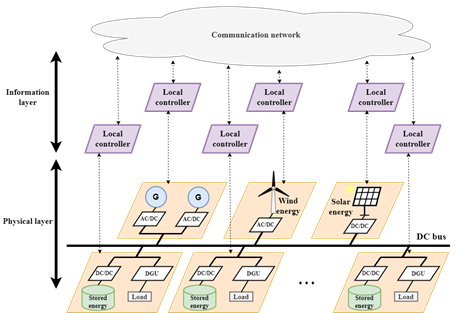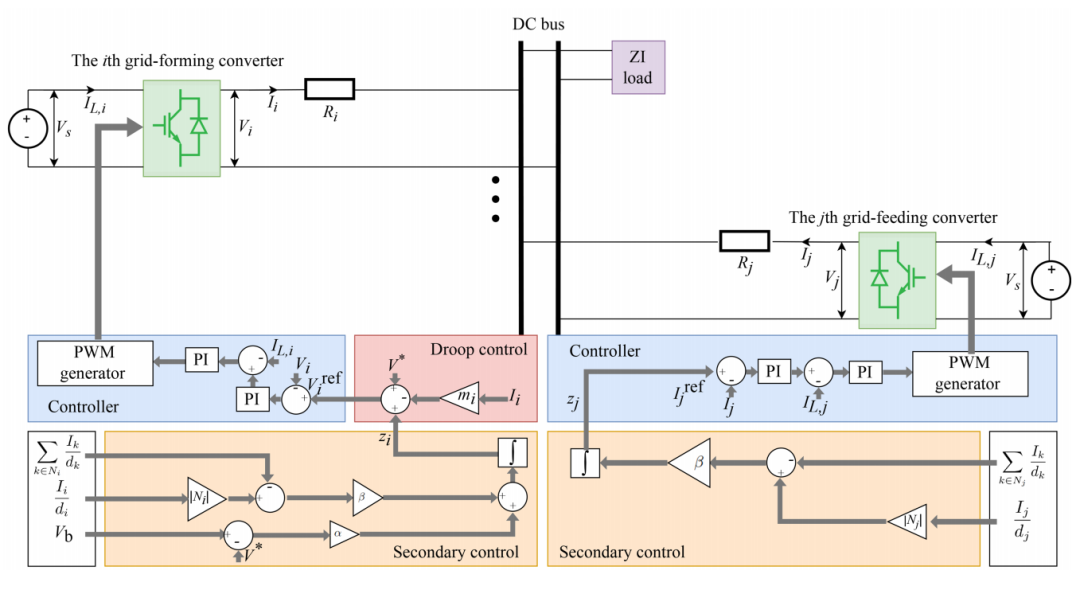 實現(xiàn)精確的電壓調(diào)控與電流分配是直流微電網(wǎng)系統(tǒng)的兩個基本控制目標(biāo)。然而,傳統(tǒng)下垂控制方法通過選取合適的下垂系數(shù),能夠?qū)崿F(xiàn)基本的但非精確的電壓調(diào)控和電流分配,由于線路阻抗、內(nèi)阻等因素的存在,僅采用下垂控制器難以解決電壓調(diào)控目標(biāo)和電流分配目標(biāo)之間的制衡影響。此外,針對實際中同時包含“構(gòu)網(wǎng)型”和“饋網(wǎng)型”兩種不同工作模式的轉(zhuǎn)換器的直流微電網(wǎng),其中構(gòu)網(wǎng)型轉(zhuǎn)換器的外接口特性為受控電壓源、饋網(wǎng)型轉(zhuǎn)換器的外接口特性為受控電流源,調(diào)控方式的異構(gòu)特點(diǎn)使得轉(zhuǎn)換器之間的協(xié)調(diào)更加困難。而現(xiàn)有僅針對構(gòu)網(wǎng)型轉(zhuǎn)換器的直流微電網(wǎng)系統(tǒng)的協(xié)同控制方法無法適用。