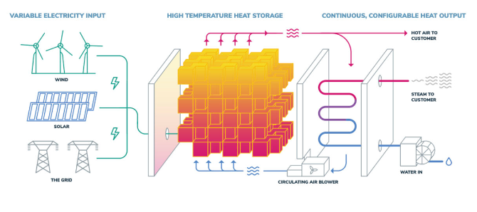 該項目采用Rondo Energy創(chuàng)新研發(fā)的熱電池儲熱技術(shù)——以耐火磚為儲熱介質(zhì)僅由“磚塊和電線”構(gòu)成。這些經(jīng)過特殊處理的耐火磚,通過電阻加熱可將溫度提升至1000℃以上,實現(xiàn)超過97%的往返效率。熱電池在電價最低的6小時內(nèi)充電,可利用離網(wǎng)光伏或電網(wǎng)電力,從而大幅降低運行成本。