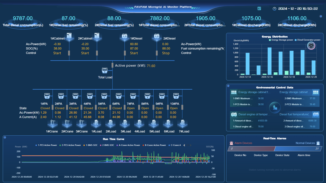 建筑工地的用電負載波動大,傳統(tǒng)柴發(fā)機組常因“大馬拉小車”導致燃料浪費。弘正EMS系統(tǒng)通過接入儲能、柴發(fā)與電表數(shù)據(jù),實時采集運行信息,動態(tài)調(diào)節(jié)系統(tǒng)狀態(tài)——負載低時優(yōu)先用儲能,負載高時柴發(fā)智能補能。通過系統(tǒng)精準調(diào)度讓工地發(fā)電機運行時長大幅縮短,燃料消耗與運維成本雙降,在兼顧經(jīng)濟性與穩(wěn)定性的同時,為工地提供可靠電力保障。
