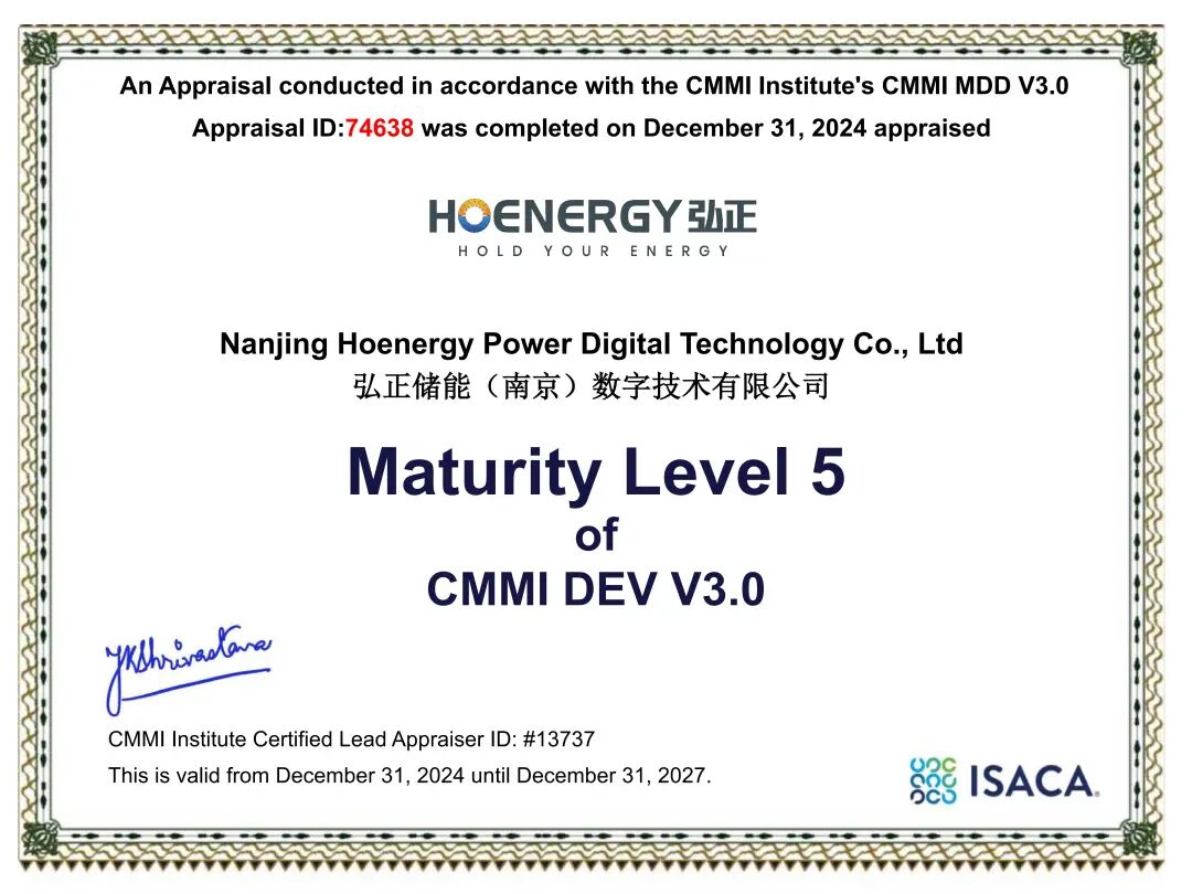 所有交付的底氣,源于弘正深耕數(shù)字化的長期積累。弘正儲能(南京)數(shù)字技術(shù)有限公司已正式通過全球軟件領域“天花板”認證——CMMI-DEV 3.0 5級,標志著企業(yè)在軟件研發(fā)、服務交付的標準化、成熟度上達到國際先進水平。