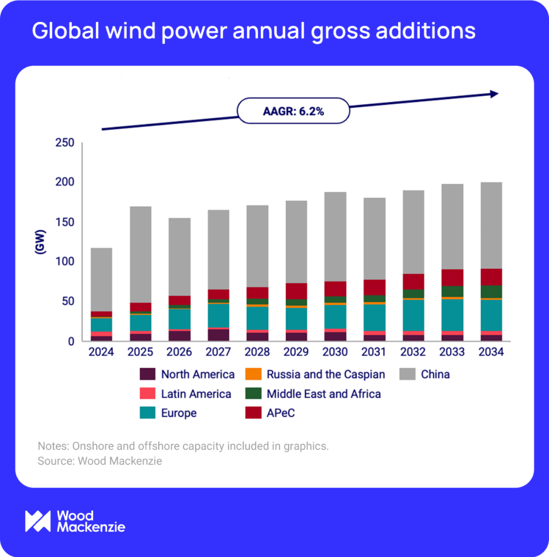 在本季度的預測中,我們將全球風電裝機預測較上季度上調13%,主要由于中國陸上風電市場預測大幅增長。到2032年,全球風電裝機容量將較2024年的水平翻倍。盡管美國等主要市場受政策的影響較大,但未來10年,行業(yè)仍將達到歷史性規(guī)模。在除中國外的市場,2031年全球風電累計裝機容量將達1TW,且到2034年全球裝機容量將較2024年水平翻倍。