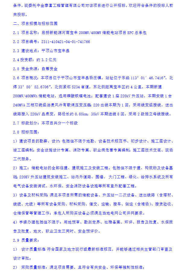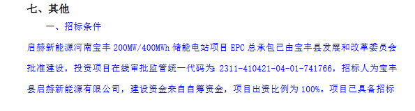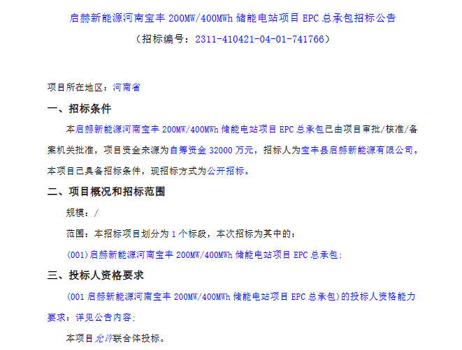 中國(guó)儲(chǔ)能網(wǎng)訊:寶豐縣啟赫新能源有限公司發(fā)布河南寶豐200MW/400MWh儲(chǔ)能EPC招標(biāo)公告,項(xiàng)目資金來(lái)源為自籌資金32000萬(wàn)元,約合單價(jià)0.8元/Wh,項(xiàng)目位于河南平頂山。