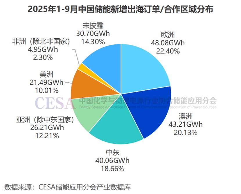 據(jù)CESA儲(chǔ)能應(yīng)用分會(huì)數(shù)據(jù)庫(kù)統(tǒng)計(jì),2025年1-9月,中國(guó)儲(chǔ)能新增出海訂單/合作總規(guī)模達(dá)214.7GWh,同比增長(zhǎng)131.75%。就儲(chǔ)能出海項(xiàng)目地分布來(lái)看,歐洲、澳洲占比均超過(guò)五分之一。歐洲最高,達(dá)48.08GWh,占比22.4%,其中波蘭7.695GWh,英國(guó)6.171GWh,德國(guó)3.71GWh,保加利亞3.7GWh。