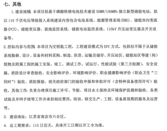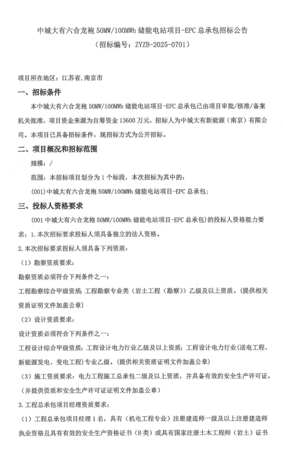 中國儲(chǔ)能網(wǎng)訊:10月24日,中城大有新能源(南京)有限公司發(fā)布中城大有六合龍袍50MW/100MWh儲(chǔ)能電站項(xiàng)目-EPC總承包招標(biāo)公告。項(xiàng)目位于江蘇省南京市,項(xiàng)目擬基于磷酸鐵鋰電池技術(shù)建設(shè)50MW/100MWh獨(dú)立新型儲(chǔ)能電站,擬以 110千伏電壓等級(jí)接入系統(tǒng)建設(shè)內(nèi)容包含電池系統(tǒng)、能源管理系統(tǒng)(EMS)、儲(chǔ)能雙向變流器(PCS)、儲(chǔ)能變壓器、就地監(jiān)控系統(tǒng)、儲(chǔ)能電站監(jiān)控系統(tǒng)、110kV升壓站變壓器及開關(guān)設(shè)備等。