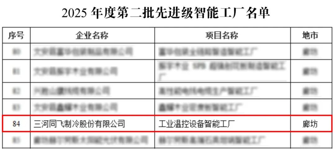 中國儲能網訊:近日,河北省工業(yè)和信息化廳等六部門聯合開展的2025年度智能工廠梯度培育行動認定結果正式公布,三河同飛制冷股份有限公司(以下簡稱“同飛股份”)憑借在數字化轉型、智能化升級領域的先進經驗,成功獲評工業(yè)溫控設備智能工廠,標志著公司智能制造水平達到國內溫控行業(yè)先進標準,邁入高質量發(fā)展新階段。