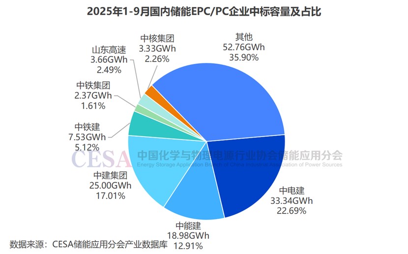 中電建、中建、中能建三大集團儲能EPC/PC合計市場占比超過50%,頭部集中度較高。