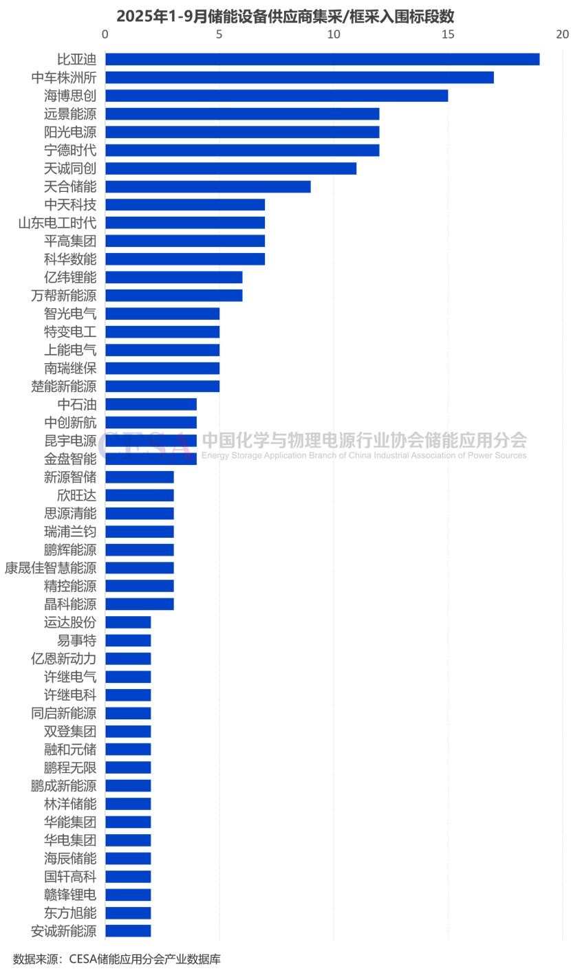 從入圍情況看,比亞迪穩(wěn)居首位,入圍標(biāo)段數(shù)量高達19個,覆蓋多個10GWh以上的集中采購項目,包括:中國能建2025年度25GWh磷酸鐵鋰電池儲能系統(tǒng)集中采購項目、中國電建集團(股份)公司2025-2026年度16GMh儲能系統(tǒng)設(shè)備框架入圍集中采購項目、中廣核新能源2025年度10.5GWh儲能系統(tǒng)框架采購。除中能建、中電建、中廣核外,比亞迪還成功入圍華能、華電、中石油、中石化、山東高速、東方電氣、新風(fēng)光、金開新能等企業(yè)儲能系統(tǒng)集采/框采項目。