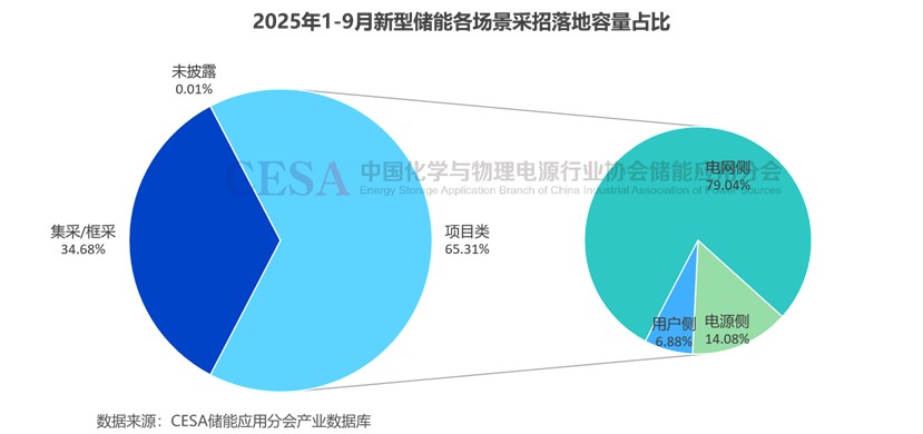 2025年1-9月,CESA儲(chǔ)能應(yīng)用分會(huì)共追蹤到1728個(gè)儲(chǔ)能采招落地項(xiàng)目,剔除同一項(xiàng)目對(duì)EPC和不同儲(chǔ)能系統(tǒng)設(shè)備多次采購(gòu)的情況,對(duì)應(yīng)的實(shí)際儲(chǔ)能系統(tǒng)需求為89.2GW/321.2GWh,同比增長(zhǎng)178%。其中,集采/框采落地規(guī)模為111.37 GWh,容量占比34.68%;項(xiàng)目類采招落地73.2GW/209.76GWh,容量占比65.31%。另有少量項(xiàng)目未披露采購(gòu)形式。