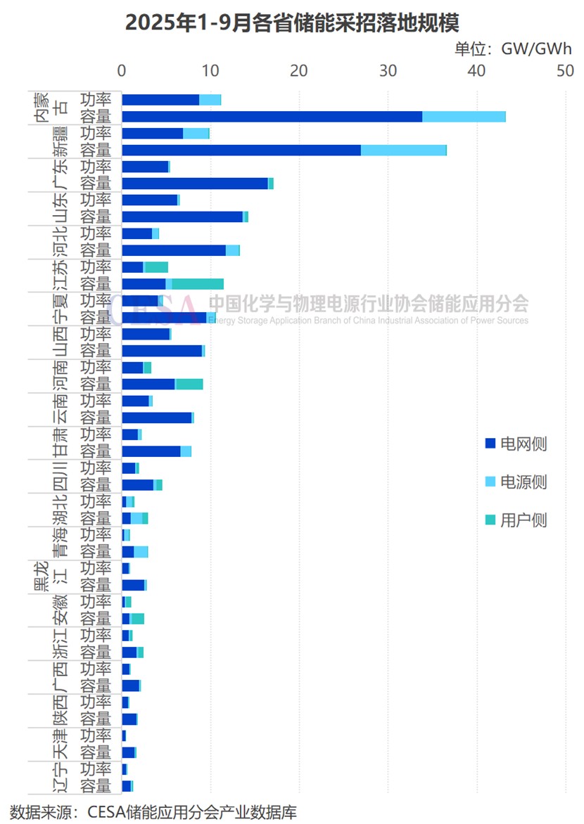 就省份來(lái)看,2025年1-9月,內(nèi)蒙古儲(chǔ)能采招落地項(xiàng)目規(guī)模躍居全國(guó)第一,達(dá)11.1GW/43.13GWh,占項(xiàng)目類采招落地總規(guī)模(73.2GW/209.76GWh)的15.17% (功率)/20.56%(容量),容量占比超過(guò)全國(guó)五分之一。伴隨新能源大基地和源網(wǎng)荷儲(chǔ)一體化項(xiàng)目推進(jìn),內(nèi)蒙古儲(chǔ)能市場(chǎng)潛力正加速釋放。