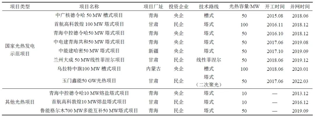 截止2023年底,我國(guó)累計(jì)并網(wǎng)投產(chǎn)光熱項(xiàng)目共計(jì)11個(gè),總裝機(jī)規(guī)模0.57吉瓦,包括能源局公布的首批光熱發(fā)電示范項(xiàng)目:8個(gè)0.5吉瓦,其他項(xiàng)目:3個(gè)70吉瓦,如下表所示: