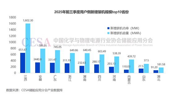 按省份來看,江蘇新增并網(wǎng)了135個項目,規(guī)模為651.67MW/1602.3MWh,領(lǐng)跑全國。江蘇也是今年前三季度全國唯一一個用戶側(cè)新增裝機過GWh的省份。安徽以新增裝機344.08MW/789.35MWh的規(guī)模排在第二。傳統(tǒng)的工商業(yè)儲能大省廣東和浙江分列三四位,新增裝機規(guī)模分別為745.05MWh、649.86MWh。此外,湖南、四川、河南新增裝機也超過500MWh。