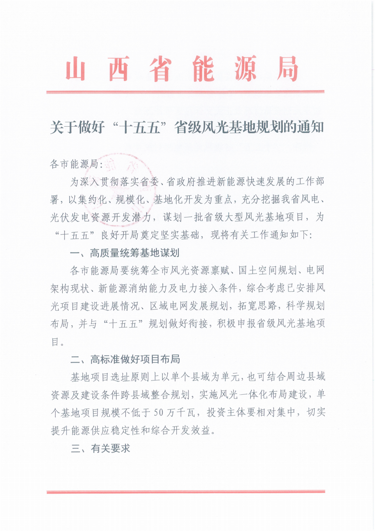 中國儲能網(wǎng)訊:近日,山西省能源局發(fā)布《關(guān)于做好“十五五”省級風光基地規(guī)劃的通知》。