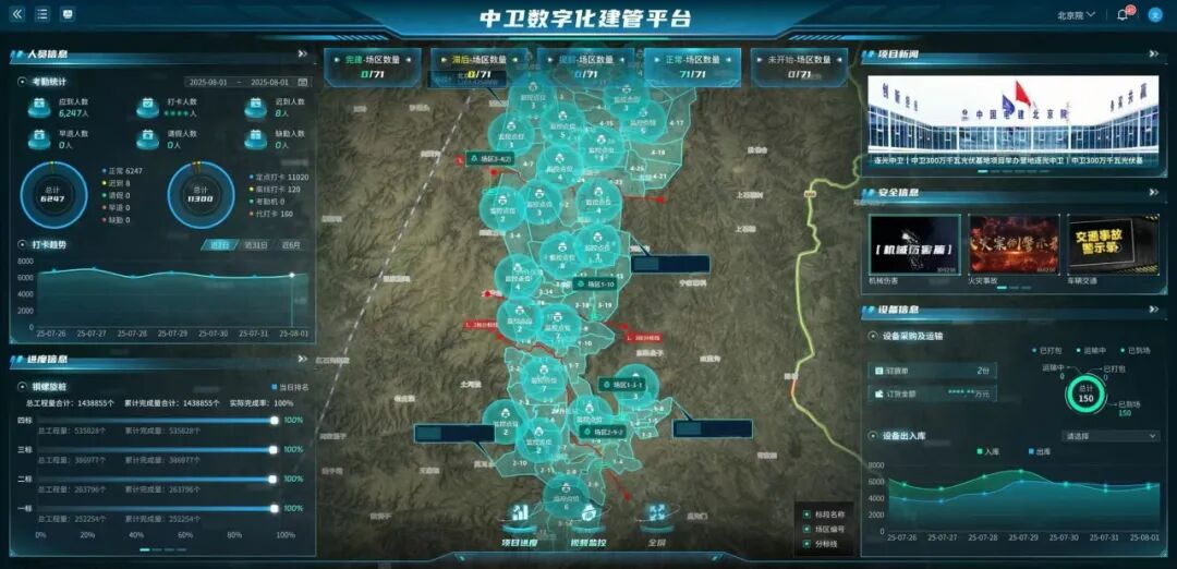 科技賦能方面,引入吊裝無人機等智能裝備,提升復雜地形條件下的作業(yè)效率;研發(fā)“中衛(wèi)數(shù)字化建設平臺”,融合離線打卡、進度看板、環(huán)境預警與設備管理等多項功能,有效破解施工區(qū)域廣闊、網(wǎng)絡覆蓋不足帶來的管理難題,確保項目全程可控、高效推進。
