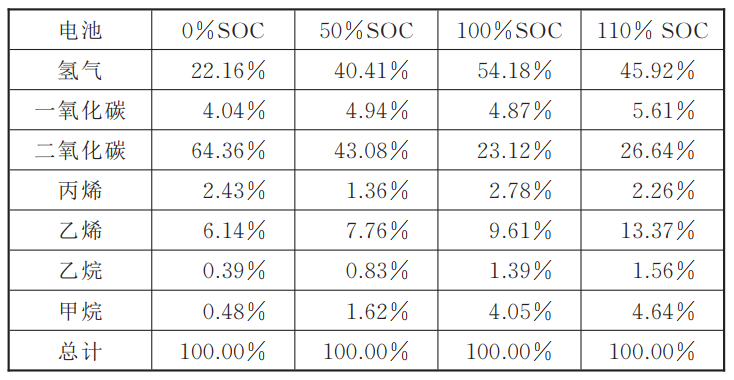 表1 不同荷電狀態(tài)電池產(chǎn)氣成分與占比