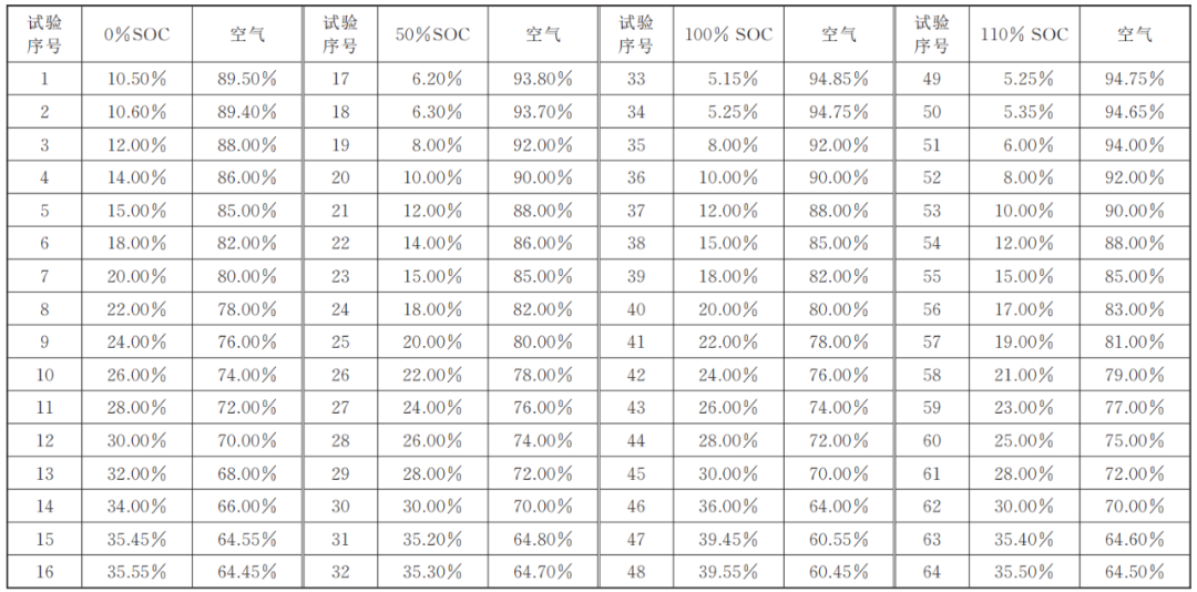 根據(jù)表1電池產(chǎn)氣組分分析的結(jié)果,配置相應(yīng)SOC條件下的4種可燃?xì)怏w作為試驗(yàn)對(duì)象,進(jìn)行后續(xù)爆炸極限測(cè)試試驗(yàn)。