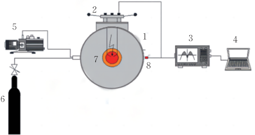 圖1為本文所使用的試驗(yàn)裝置示意圖,1是20 L球形腔,是進(jìn)行預(yù)混氣體爆炸極限測(cè)試的反應(yīng)容器,防爆不銹鋼材質(zhì),內(nèi)部最大半徑為300 mm,內(nèi)部最大高度為350 mm,額定最大承壓能力為20 MPa,工作溫度為室溫至120 ℃;2是點(diǎn)火電極,下端可纏繞連接一次性點(diǎn)火頭,用于點(diǎn)火爆炸;3是壓力數(shù)據(jù)采集儀,與傳感器相連,用于采集試驗(yàn)過(guò)程的壓力數(shù)據(jù);4是計(jì)算機(jī),與數(shù)據(jù)采集儀相連,用于數(shù)據(jù)記錄與成圖;5是真空泵,用于抽氣、換氣等試驗(yàn)過(guò)程;6是混合氣,試驗(yàn)對(duì)象;7是觀察窗,材質(zhì)為防爆玻璃,用于觀測(cè)整個(gè)試驗(yàn)過(guò)程;8是壓力傳感器,用于測(cè)量氣體爆炸壓力。
