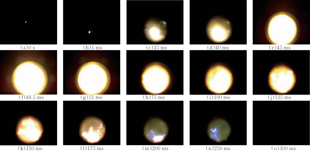圖2為試驗(yàn)序號(hào)42的點(diǎn)火爆燃過(guò)程高速攝影圖片,拍攝零點(diǎn)為點(diǎn)火頭導(dǎo)通時(shí)刻。試驗(yàn)結(jié)果表明,從火花產(chǎn)生到火焰完全熄滅整個(gè)過(guò)程用時(shí)約300 ms。根據(jù)圖2試驗(yàn)過(guò)程,可將全過(guò)程分為5個(gè)階段:第1階段為點(diǎn)火階段(0~1 ms),通電使點(diǎn)火頭作用,進(jìn)而點(diǎn)燃預(yù)制混合氣體;第2階段為燃燒I階段(1~45 ms),點(diǎn)火頭附近的預(yù)混氣體迅速燃燒,同時(shí)火焰向四周蔓延;第3階段為燃燒轉(zhuǎn)爆炸階段(45~51 ms),在點(diǎn)火頭附近的預(yù)混氣體從燃燒演變成爆炸,并在48.5 ms爆燃最劇烈,同時(shí)產(chǎn)生365 kPa爆炸壓力;第4階段為燃燒II階段(51~175 ms),爆炸導(dǎo)致預(yù)混氣體含量迅速降低,產(chǎn)生大量惰性氣體CO2,延緩了反應(yīng)進(jìn)程,所以爆炸衰退成了燃燒,且火焰開(kāi)始衰弱;第5階段為熄滅階段(175~300 ms),預(yù)混氣體燃燒完全,火焰逐步熄滅。