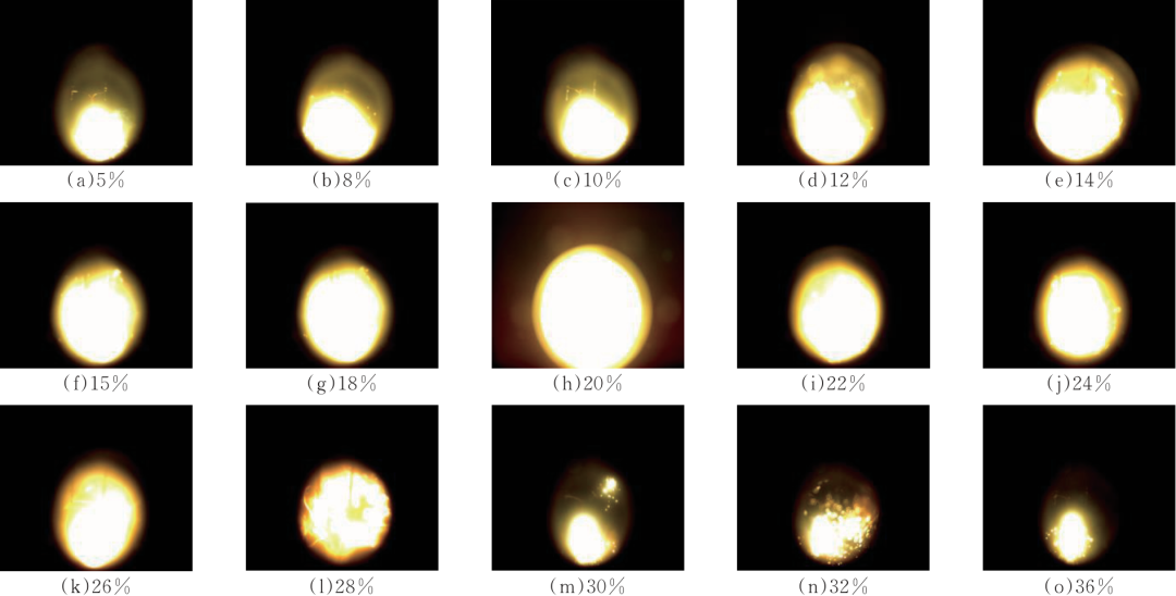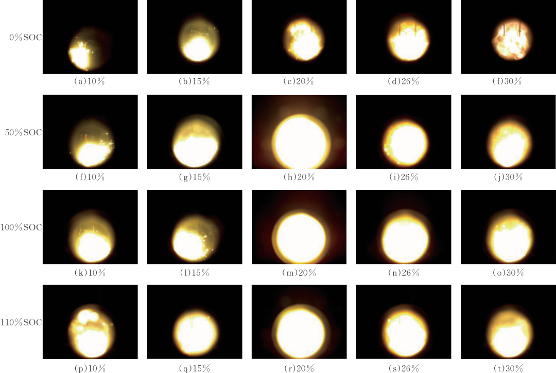 圖4為0%~110%SOC電池在10%、15%、20%、25%和30%不同比例可燃?xì)怏w的預(yù)混氣體在48.5 ms時(shí)刻高速攝影圖片。由圖4可知,0%、50%、100%SOC和110%SOC電池?zé)崾Э乜扇細(xì)怏w分別在體積分?jǐn)?shù)為26%、20%、20%和15%時(shí)呈現(xiàn)出最劇烈反應(yīng)現(xiàn)象。隨著SOC的增大,反應(yīng)最劇烈時(shí)刻對(duì)應(yīng)的可燃?xì)怏w體積分?jǐn)?shù)逐漸減小,說(shuō)明隨著SOC的增大,磷酸鐵鋰電池?zé)崾Э貧怏w愈發(fā)危險(xiǎn)。由式(1)計(jì)算可知,0%SOC、50%SOC、100%SOC、110%SOC電池?zé)崾Э乜扇細(xì)怏w理論最佳配比分別是26.11%、20.30%、19.71%和15.23%,說(shuō)明可燃?xì)怏w和空氣的體積比例與理論配比最接近的預(yù)混氣體。