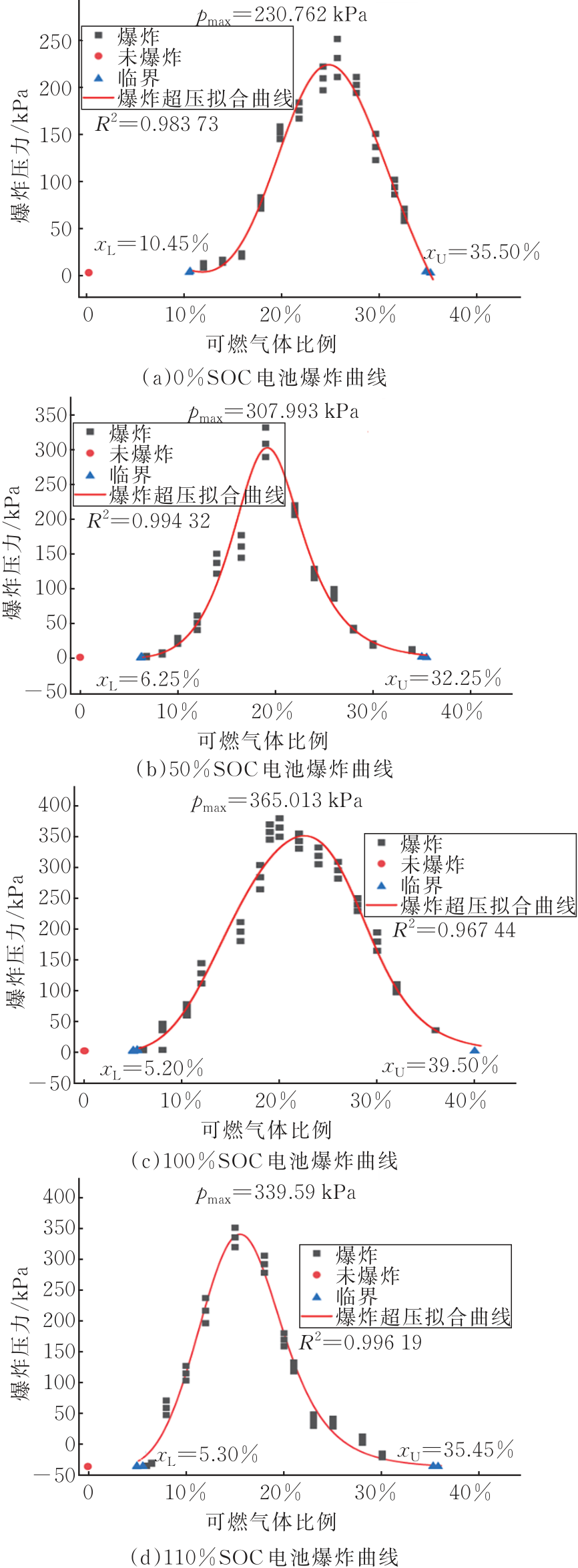 圖5為0%SOC、50%SOC、100%SOC和110%SOC磷酸鐵鋰電池按表2試驗(yàn)測(cè)得的預(yù)混氣體爆炸壓力值,通過(guò)Origin軟件使用六階多項(xiàng)式擬合而成。由圖5可知,預(yù)混氣體的爆炸壓力隨著可燃?xì)怏w體積分?jǐn)?shù)的增加先增加后減小??諝夂涂扇?xì)怏w在電點(diǎn)火頭的作用下發(fā)生燃燒,并放出熱量。當(dāng)預(yù)混氣體中氧氣的占比過(guò)低時(shí),燃料沒(méi)有充分燃燒,壓力較低。隨著氧氣含量的逐漸增加,更多可燃?xì)怏w參與反應(yīng),反應(yīng)速率增加,壓力也隨之增大。當(dāng)可燃?xì)怏w與氧氣占比接近反應(yīng)方程式理論比值時(shí),燃燒反應(yīng)充分,此時(shí)的壓力達(dá)到峰值。然而,隨著氧氣進(jìn)一步增加,過(guò)多的氧氣阻礙了可燃?xì)怏w的擴(kuò)散,稀釋了燃燒區(qū)域的溫度,從而降低了爆炸壓力。