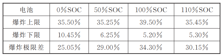 將圖5中不同荷電狀態(tài)電池的爆炸上限、爆炸下限及爆炸極限差進(jìn)行整理,得表3。由表3可知,0%SOC、50%SOC和100%SOC的電池?zé)崾Э禺a(chǎn)氣組分,隨著SOC的增加,爆炸極限差從25.05%增大到34.30%,而110%SOC的爆炸極限差減小到了30.15%。0%SOC~100%SOC的爆炸極限差依次增大,是由于隨著電池?zé)崾Э貧怏w成分中CO2含量增加,不飽和烴含量減少,CO2作為惰性氣體,有抑制爆炸的作用,從而造成爆炸極限差的減小。不飽和烴中的雙鍵結(jié)構(gòu)不穩(wěn)定,具有更大的反應(yīng)活化能,與含量較少且相對(duì)穩(wěn)定的烷烴相比,不飽和烴含量是影響電池?zé)崾Э貧怏w爆炸極限范圍的主要因素。而110%SOC出現(xiàn)了爆炸極限差減小,也是因?yàn)槠洚a(chǎn)氣組分的CO2含量高于100%SOC,見(jiàn)表1。