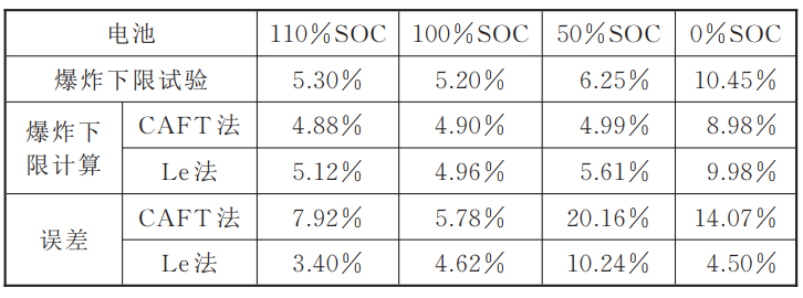 表3 不同荷電狀態(tài)電池爆炸上限、下限和極限差